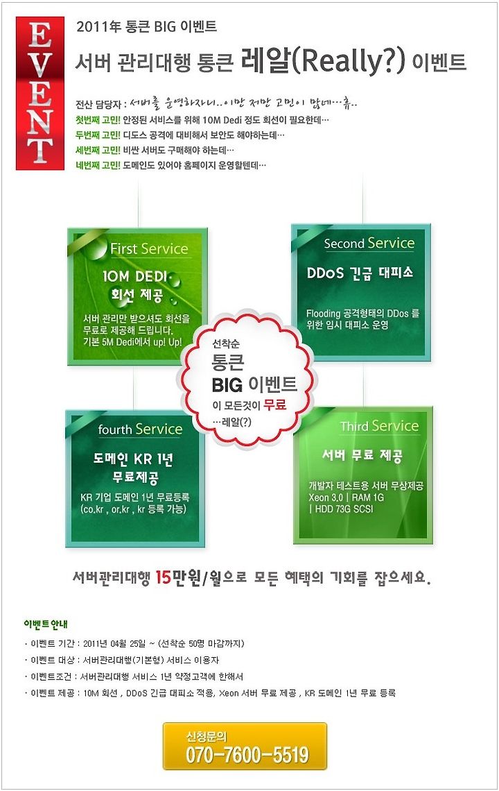 공지 이호스트, 통큰 BIG 이벤트! (서버관리대행 편) 이호스트ICT 2011. 4. 22. 16:56 그린IDC에서 서버관리비용으로 코로케이션 , DDoS 보안서비스, 서버 장비 무료 제공, KR 도메인 무료등록 이벤트를 오픈합니다. 이벤트 바로가기 : http://www.greenidc.co.kr